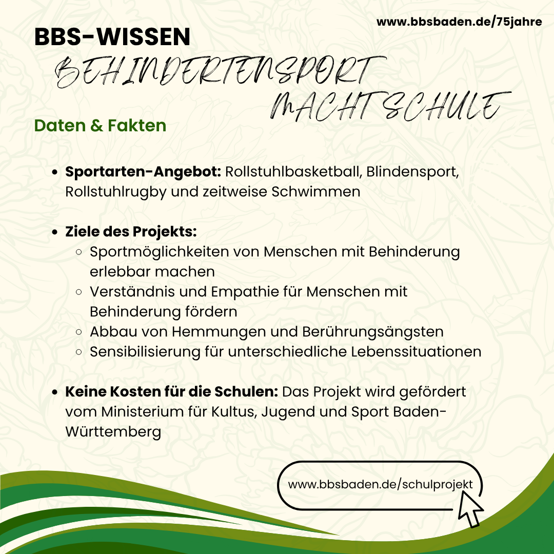 Mit dem Projekt verfolgen wir das Ziel, Kindern und Jugendlichen die vielfältigen Sportmöglichkeiten von Menschen mit einer Behinderung näher zu bringen. Zu dem bekommen die Schülerinnen und Schüler einen Einblick in das Leben von Menschen mit Behinderungen und werden für die Lebensbedingungen dieser Menschen sensibilisiert. Durch den Sport werden Distanzen und Hemmungen abgebaut. "Behindertensport macht Schule" ist ab Klassenstufe 3 möglich und soll im Sportunterricht oder anlässlich von Projekttagen umgesetzt werden. Im Vordergrund stehen das Miteinander und natürlich der Spaß am Spiel und an der Bewegung. Neue Erfahrungen im Umgang mit dem Rollstuhl beim Rollstuhlbasketball und Rollstuhlrugby oder beim Blinden-Torballspiel, sensibilisieren für unterschiedliche Lebenssituationen und rücken das gegenseitige Verständnis in den Blickpunkt. Sport und Spiel sollen auf ein Miteinander ohne Hemmschwellen und Barrieren vorbereiten. Behindertensport macht Schule spricht sportliche Bewegung, soziale Kompetenz, koordinative Fähigkeiten und Kreativität gleichermaßen an.